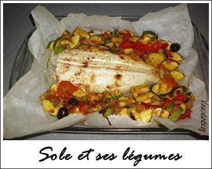 dans un plat allant au four , déposez une feuille de papier sulfurisé et poser dessus la sole et les légumes que vous disposerez autour du poisson.